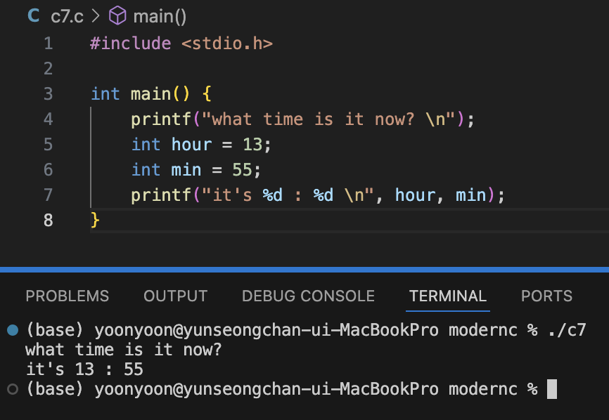 printf("it's %d : %d \n", hour, min);
