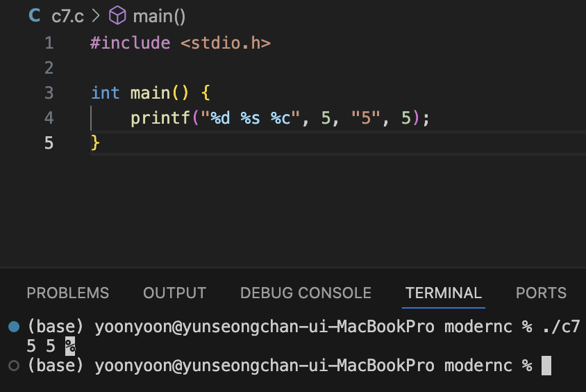 printf("%d %s %c", 5, 5, 5);
